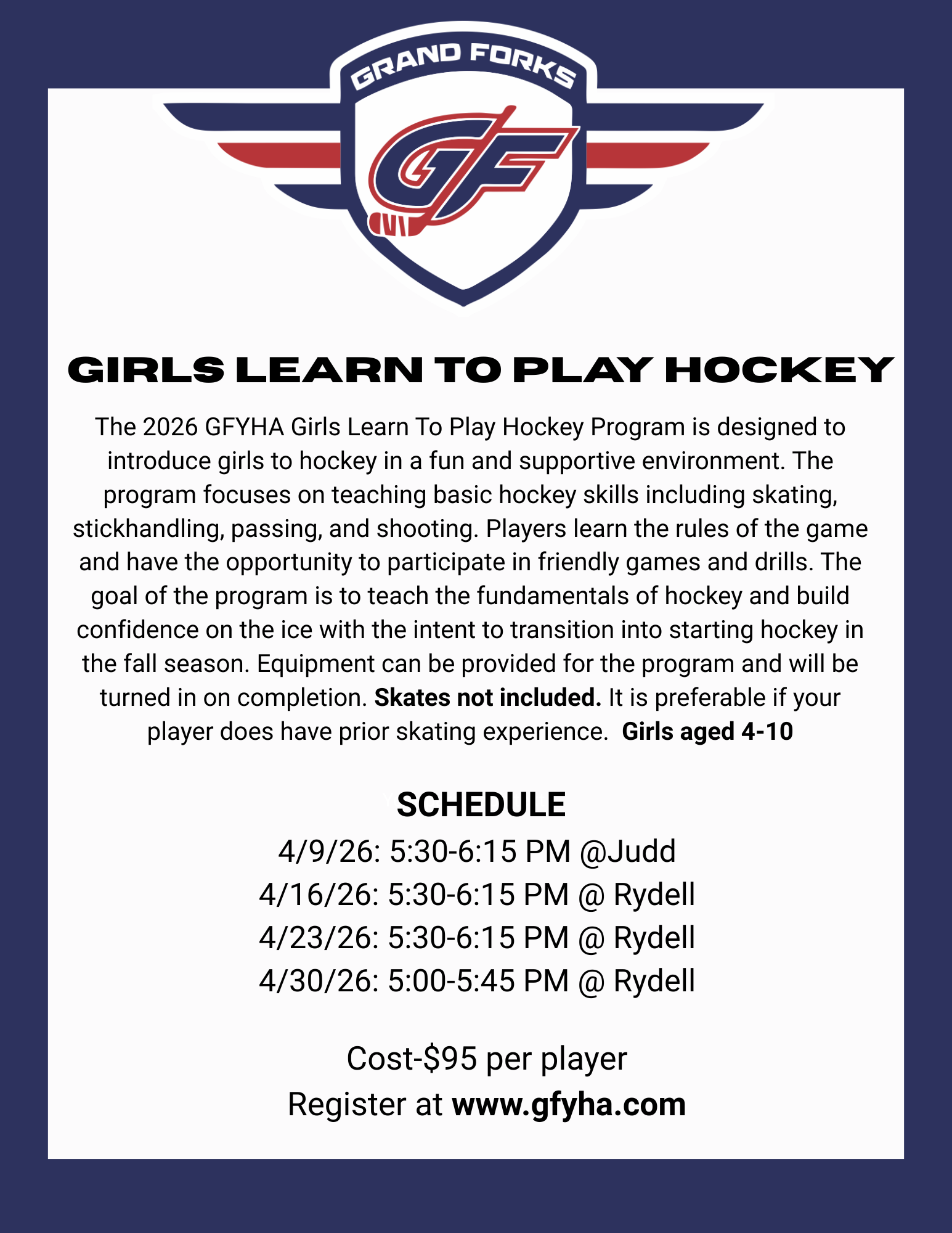 The 2026 GFYHA Girls Learn To Play Hockey Program is intended for girls new to hockey and is designed to introduce players to hockey in a fun and supportive environment. The program focuses on teaching basic hockey skills including skating, stickhandling, passing, and shooting. The goal of the program is to teach the fundamentals of hockey and build confidence on the ice with the intent to transition into starting hockey in the fall season.