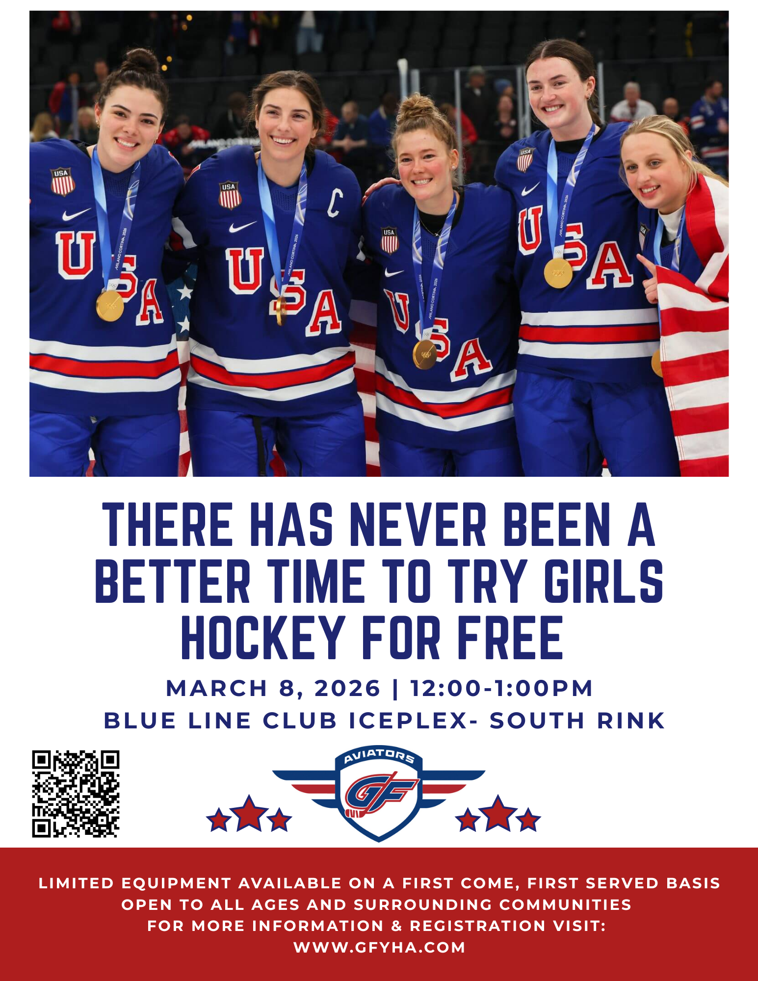 Try Girls Hockey for Free is a free event hosted by Grand Forks Youth Hockey Association to introduce girls to the sport of ice hockey.